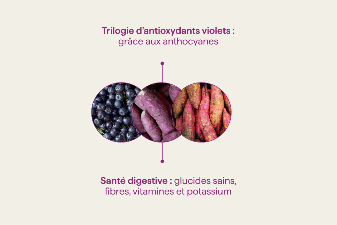 Les anthocyanes de l’ube contribuent à lutter contre le stress oxydatif et sont associées à des effets bénéfiques sur l’inflammation et certains marqueurs cardiométaboliques selon la littérature nutritionnelle sur les pigments pourpres. Sa teneur en fibres soutient la satiété, le confort digestif et peut aider à l’équilibre lipidique, ce qui en fait un ingrédient intéressant au quotidien. L’apport en potassium et en vitamine C complète le profil, participant respectivement à l’équilibre de la pression artérielle et à la protection cellulaire et immunitaire.